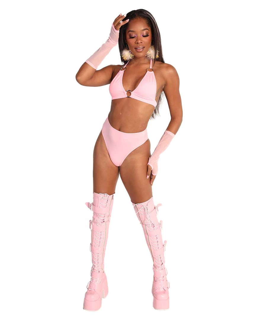 Give ur look a sugary sweet touch with the Roma x iHR Born A Winner O-Ring Triangle Top. This triangle top has a plunging neckline, silver o-ring accents, and an open-back design.Â