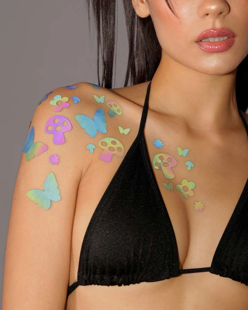 Show off ur fun personality with our Shroom Party Rainbow Reflective Body Stickers. Featuring an iridescent finish that reflects light, these body stickers are guaranteed to help u light up the night.