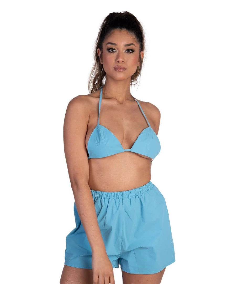 Make boss moves in our See Ur Reflection Bikini Top Set. This stunning combo comes with an ultra-reflective grey triangle bikini crop top with a neck and back tie closure and athletic high waisted shorts.