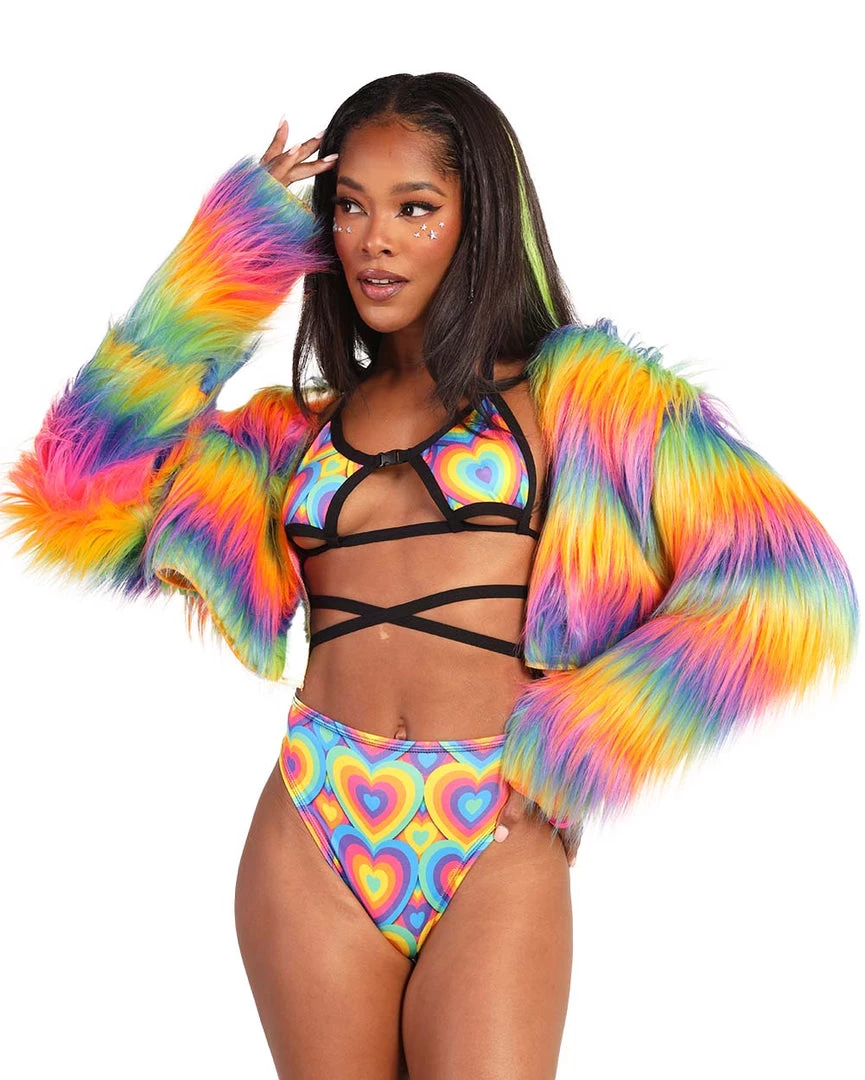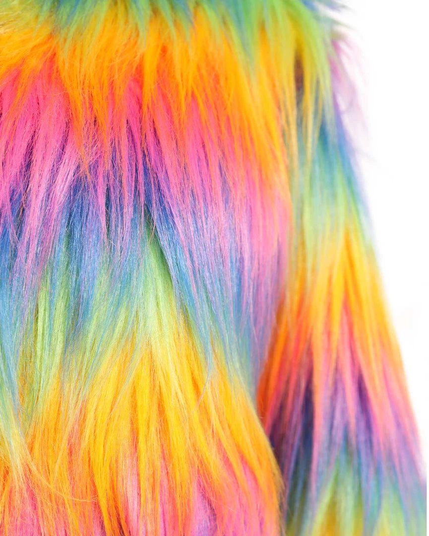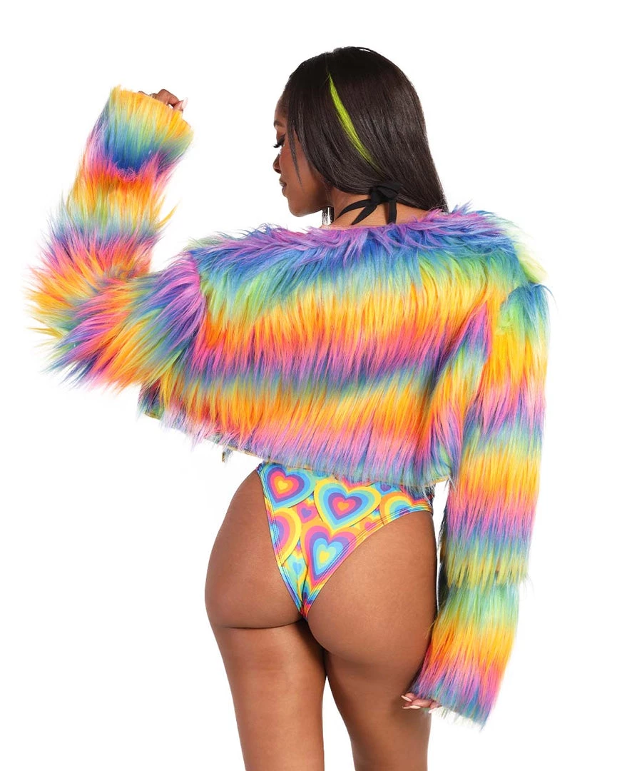 U are rainbow itself with our Rainbow In My DNA Fur Crop Jacket. Bring nothing but good vibes in this fur jacket with a cropped design and multicolored ombre print all over.Â
