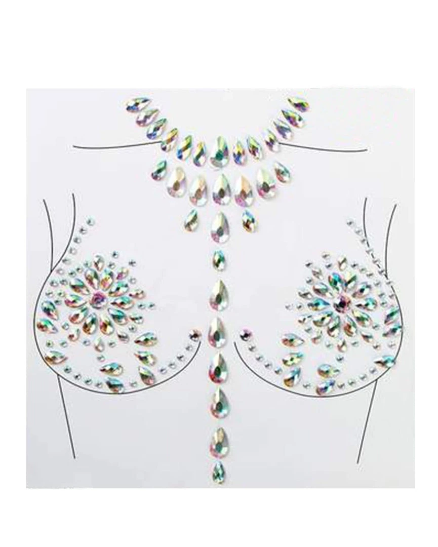Leave the crowd wander struck in our Show Pony Chest and Boob Jewels. These enchanting jewel pieces are a perfect combo of pearl and iridescent jewels that will catch everyone’s eye.