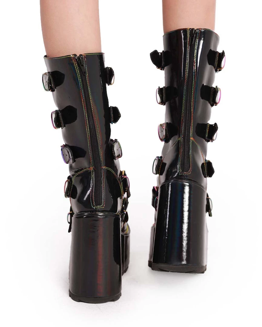 Show off ur love for shrooms with the YRU Dune Rainbow Mushroom Platform Shoes. These black platform boots have a glossy finish, thick soles, buckle accents, and a mushroom design.